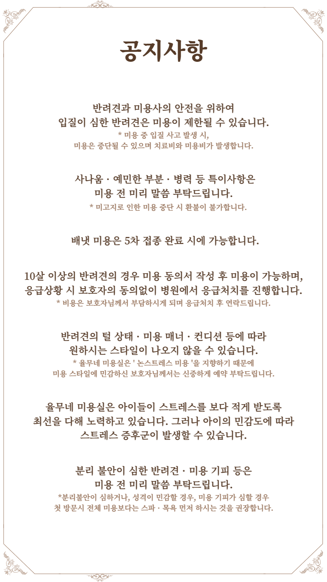 | 무게 | 위생 | 위생+목욕 | 전체미용 | 스포팅 | 가위컷 |
